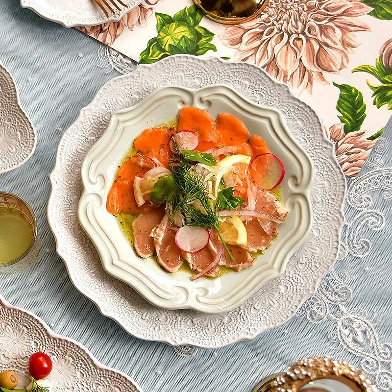 【コメント】上品なレースをモチーフとしたテーブルウェアは、特別なおもてなしやギフトに最適です。電子レンジ・食洗機・オーブンがご利用いただけます。すべてハンドメイドの為、色ムラ、黒点、気泡など、商品に個体差が生じる場合がございます。