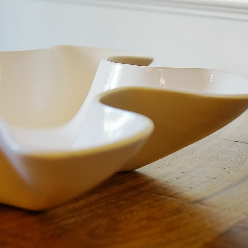 【コメント】流線型の真っ白な花器です。お花が映えること間違いなし。そのほかプレートとして、オブジェとしていろいろ使えそうです。今回は長期展示しておりましたので、訳ありセールにさせていただきました。